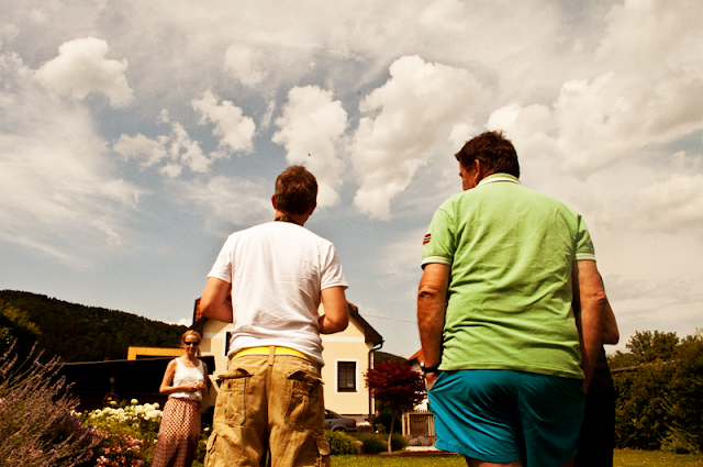 After taking a small break to relax and process the tons of food we'd just consumed, we went to the front side of our garden and Clemens presented his new found love for a mini chopper (that holds a camera on the bottom) to us. In technical terms it's called "drone", I guess because it makes the same humming noises like the actual insect.